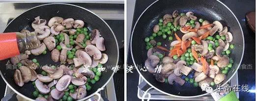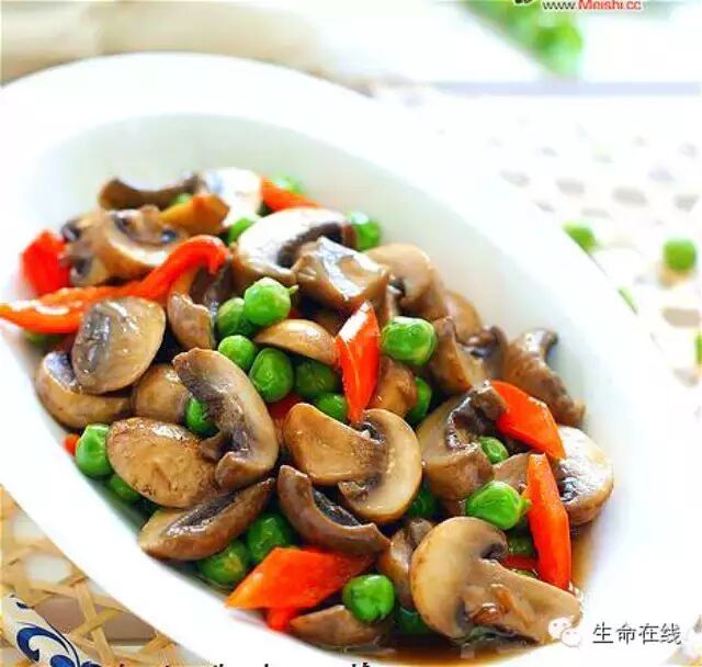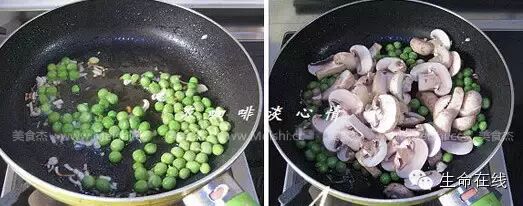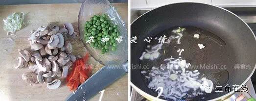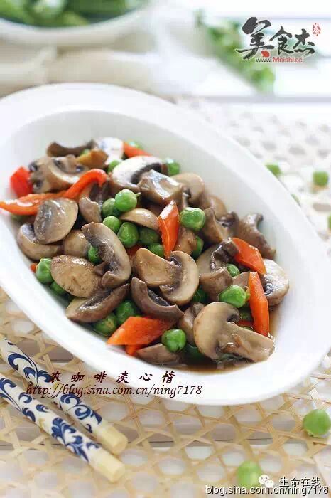 1.豌豆粒洗净备用,口蘑洗净切片,红椒洗净切小菱形片