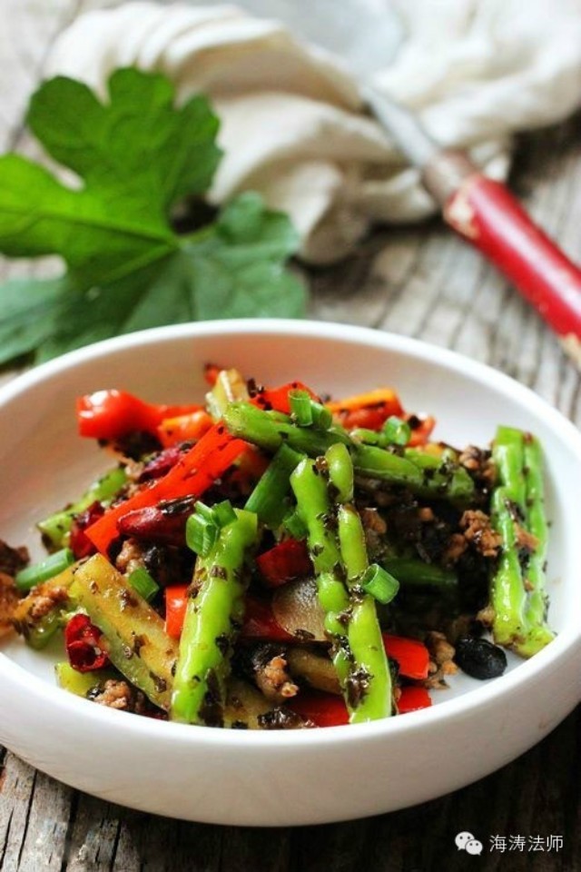 红椒(1/2只)素肉馅(100克)碎米芽菜(30克)老姜(1块)干辣椒(2个)干花椒(10粒)豆豉(1勺)