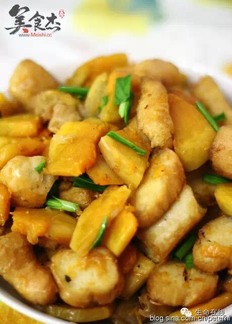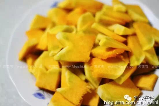4.南瓜7成熟后,加盐适量,加入切好的油条、青菜末