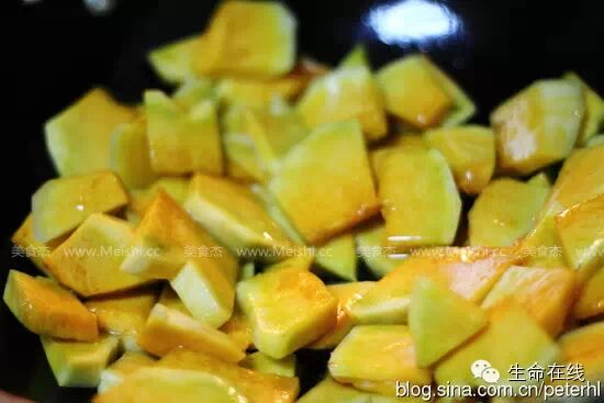 3.加入少量植物油,油热后放入南瓜片,爆炒,过程中可以加适量水