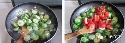 3.煸炒出香味后放入对开两半的抱子甘蓝甘蓝