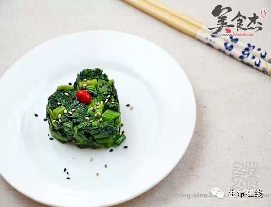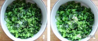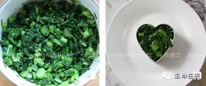 7.倒入油,抓拌均匀;用模具放入盘中,填入拌好的菜心