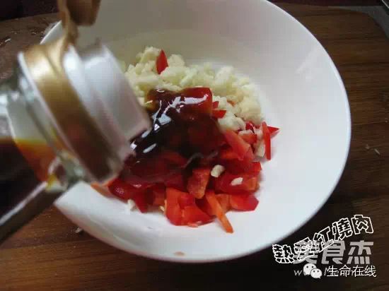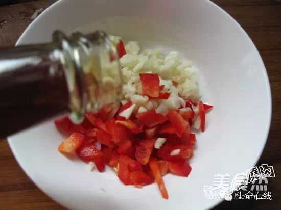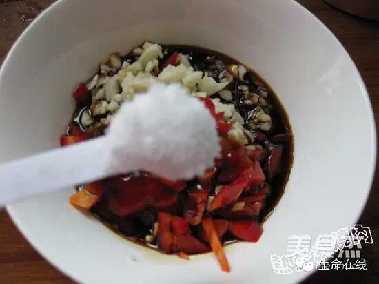 这时准备好调料汁,将彩椒切末姜剁碎放在碗里,加适量素鲍鱼汁