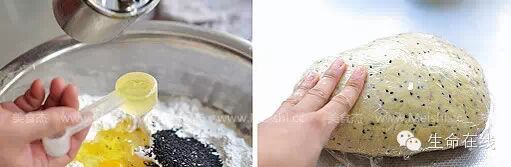 1.1000g面粉中加入黑芝麻25g,盐15g