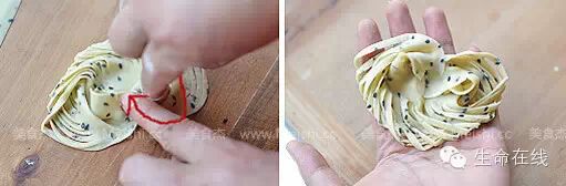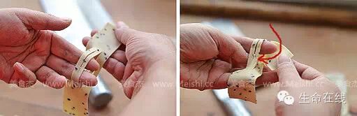 19.做另一种翻花。跟刚才第13步一样,只不过切的刀数要多一些,之后各取一半压紧