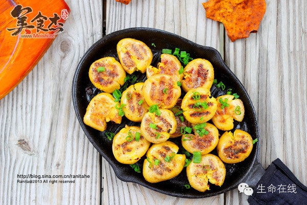 5.大概煎1-2分钟,然后翻面,同时撒上盐和胡椒粉,出锅撒上空心菜即可