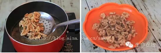 1、核桃先用开水焯一下,可去除涩味,过冷水能让核桃口感更香脆;