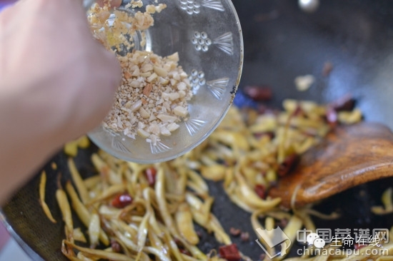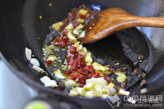 9.花椒出香味后倒入干辣椒和姜、这时候放入、姜不会糊掉