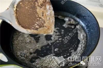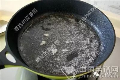 9.将水倒入锅中(比例大约是白糖150克、水50克、油10克)