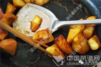 14.用锅铲快速翻动,使糖汁均匀裹满红薯表面。出锅。