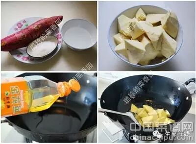 3.锅内倒入油,红薯属于根茎类原料,所以油温以五成热为宜