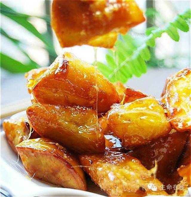 5、拔丝菜成菜后立即上桌,必须马上食用,方可拉出长长的糖丝,冷了就拔不出丝了。