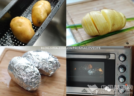 3、4、将切好的土豆用锡纸包好,烤箱预热220度,上下火中层,烤制40分钟熟透;培根切成5CM一段的片备用;