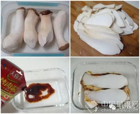 6. 以此类推,将杏鲍菇都排进料盒,抹上烤肉酱,腌制半小时以上。