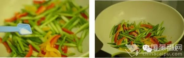 3.炒至芦笋变色后放入红、黄甜椒拌炒;