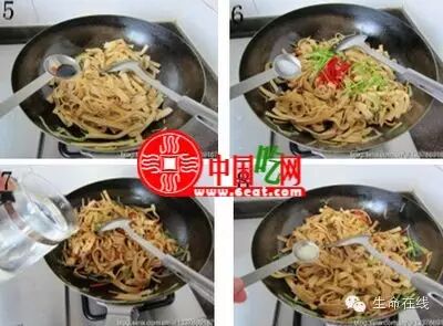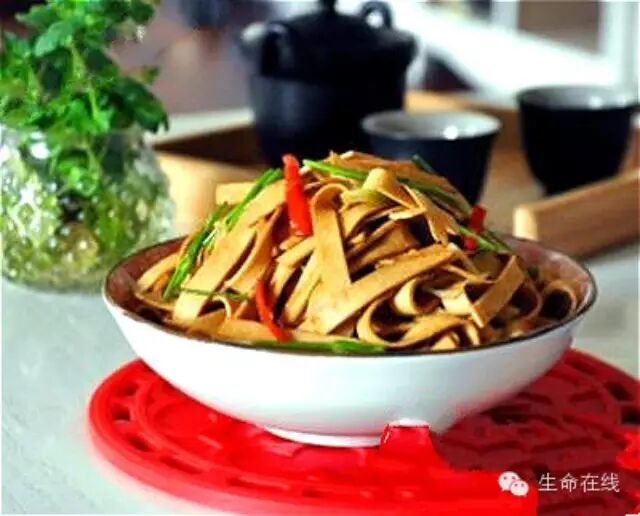 3、“辣”的程度是可以调节的:辣椒丝与姜一起、甚至先于姜丝煸炒,辣味最容易充分释放,菜品口感最辣;辣椒丝与豆腐皮一起入锅煸炒,次之;最后放辣椒丝