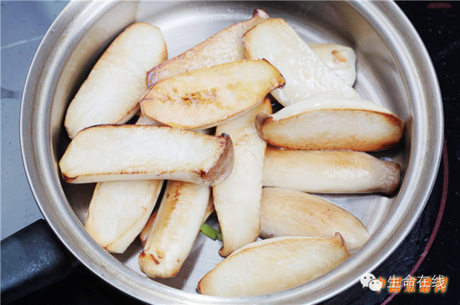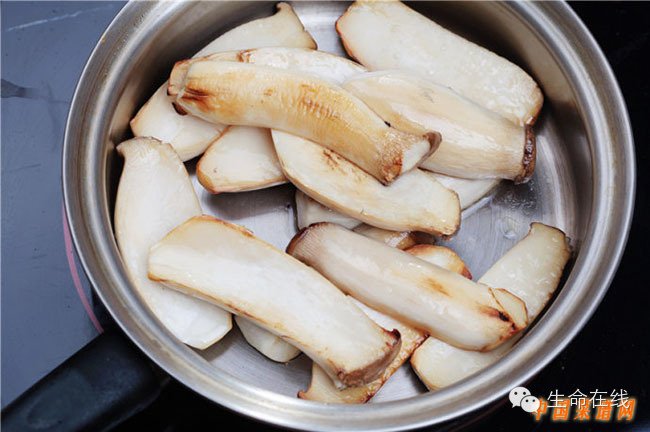 2、锅烧热下少许油,然后下杏鲍菇翻炒,因为杏鲍菇肉厚要把杏鲍菇的水分煸炒出来,煸炒至杏鲍菇表面微微发黄即可