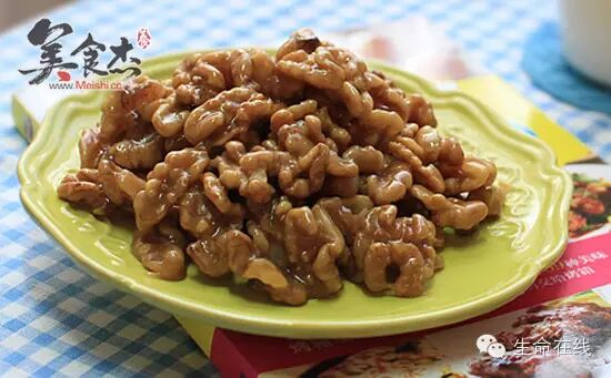 3.将油和砂糖或者冰糖用小火加热至金黄冒大泡,立即倒入核桃,使每一颗核桃都能均匀沾上糖浆,最后可以撒一些熟的芝麻,会更香