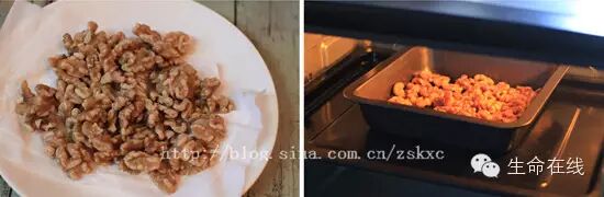 2.核桃沥水,用厨房纸吸干水分,放入预热好的烤箱,中层、160度、13分钟