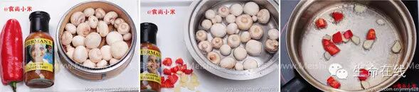 1.红椒切块、姜切片,口蘑洗净,做锅清水,水开后将蘑菇下锅,略微焯一下,也就是略煮1钟捞出控干待用