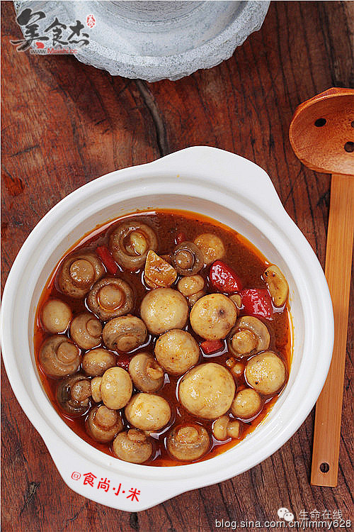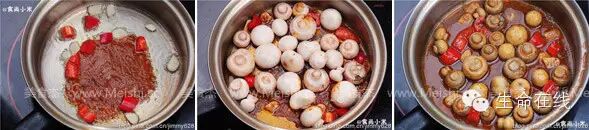 5.直至每个蘑菇都包裹上咖喱,放上一小碗水大火烧开咖喱酱搅拌开,转小火,盖盖慢慢炖,直至蘑菇入味