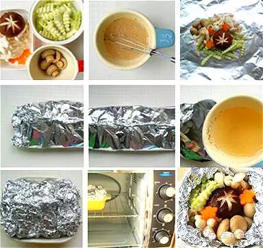 香菇1只18g、白玉菇60g、罐装口蘑4粒45g、胡萝卜3片5g、丝瓜90g、铝箔纸一张;