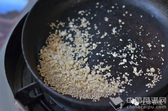 2.花生切碎和芝麻在锅中干炒成熟