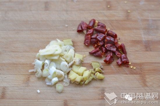 5.干辣椒切碎,生姜2片,改刀成片