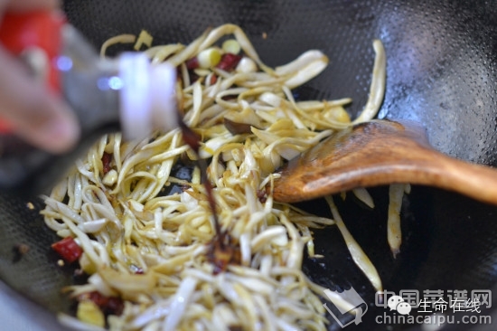 11.这时候火关小,加入1小勺糖,盐和鸡精各1/2小勺,再放上1大勺素蚝油,如果火大了,酱油会糊掉