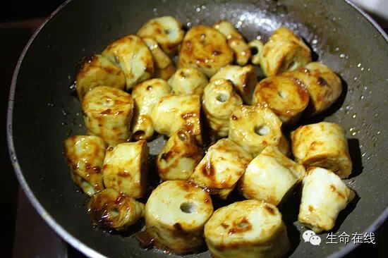 这种做法比较少油、健康,还可以将水面筋在油中稍微煎炸一下,更容易吸收酱汁。
