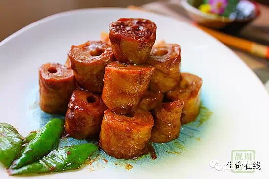 将素肠倒入黄豆酱中,翻炒,酱汁均匀裹住素肠,再加蚝油、生抽等调味,黄豆酱和蚝油均有糖份,喜欢口味更甜的可以加少许糖