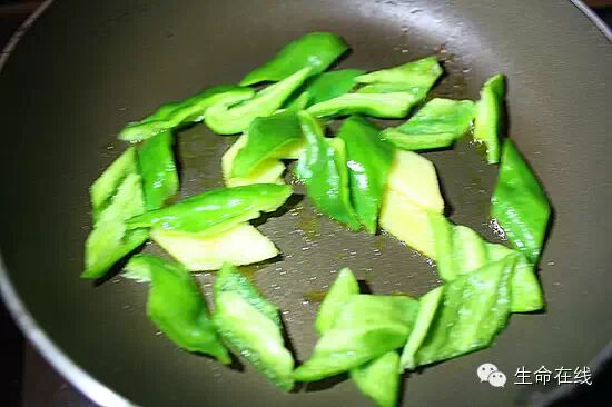 锅内倒植物油,将青椒和生姜片煸炒至9成熟,备用