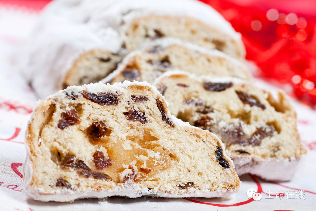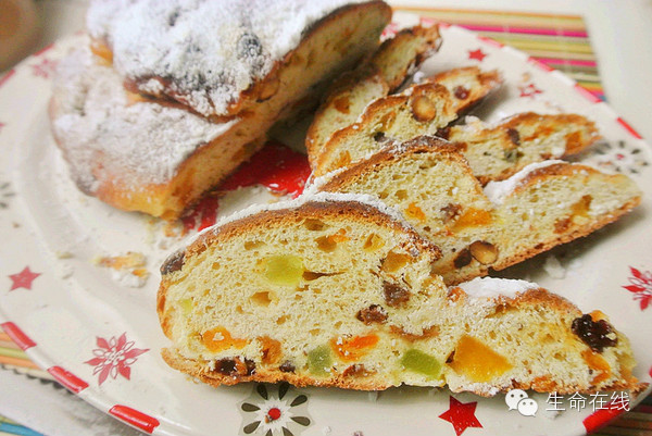 圣诞节的Stollen,通常需提前准备.干果提前浸泡在素啤酒中入味,面团中通常还加入各式香料,烤后的面包趁热