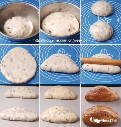 5、排入烤盘中,发酵40分钟左右至两倍大。刷橄榄油。烤箱预热170度,中上层,25分钟左右。面包出炉后,趁热均匀的刷桂圆干用之前彻底挤干,加面粉裹一下,筛掉多余的粉,这样更容易揉入面团中,也避免浸泡后的干果水份太多。