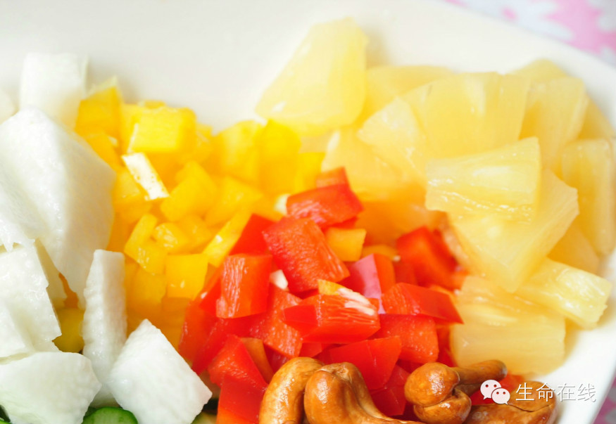 2)把彩椒和青椒洗净切成比花生粒稍微小点的粒。