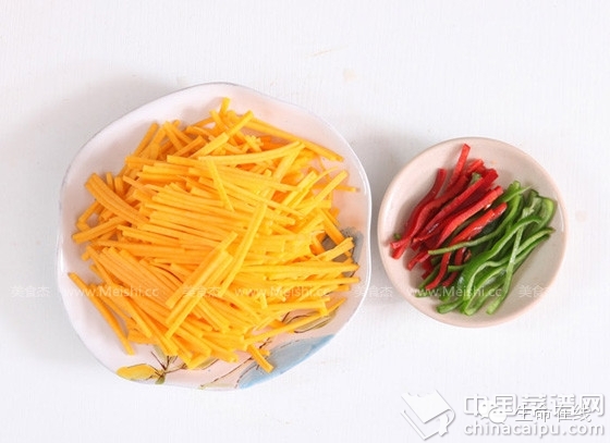 1.南瓜洗净去皮切成细丝、青红椒洗净切丝