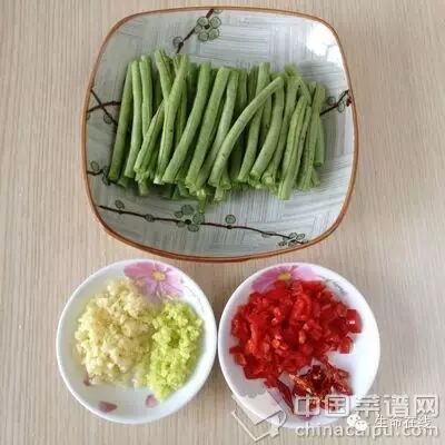 2、豆角洗净,摘去老筋切长段,生姜、大蒜剁碎,红尖椒切小粒,干辣椒斜圈。