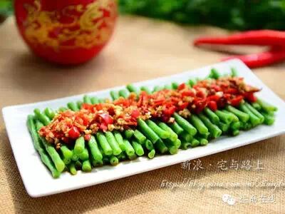 3、煮锅坐水,水开后加少许盐和数滴油,下豆角,不加盖中火煮约3分钟至熟。