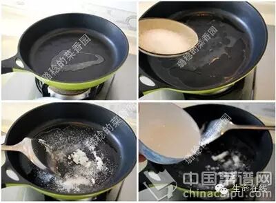 9.将水倒入锅中(比例大约是白糖150克、水50克、油10克)