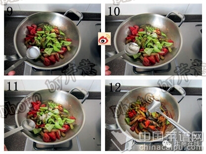 9、同时加入生抽、老抽和糖,煸炒均匀;