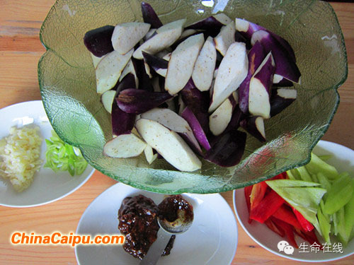 材料及处理:茄子洗净带皮切滚刀块儿,加入少许盐,拌匀腌渍片刻;