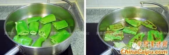2.热锅薄薄刷一层油,下辣椒中火煎,边煎边用锅铲按压,两面都煎的有点焦后盛出备用