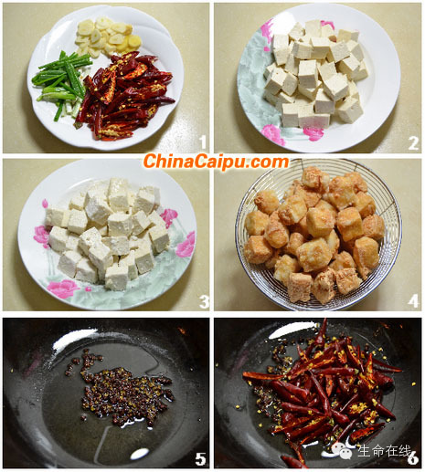 老豆腐1大块 干辣椒2把 花椒1汤匙 生姜1块 空心菜梗少许
