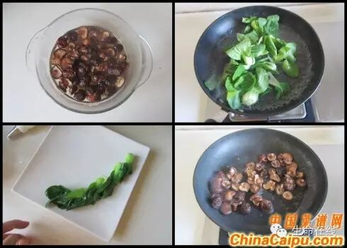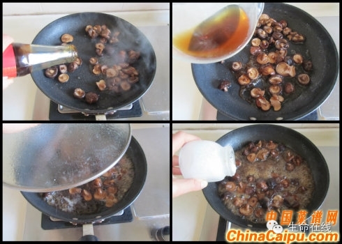 4. 烧热锅,放少许油,下入泡好的小花菇翻炒;