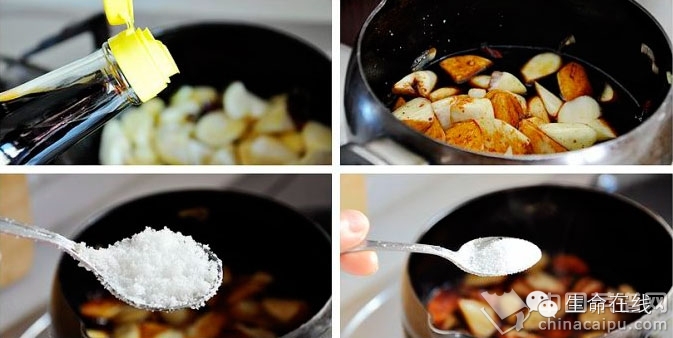 4.加老抽喷香后,加清水;开锅后加糖、盐调味;