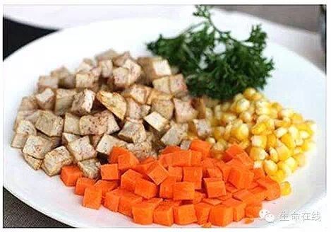 1、把香芋、胡萝卜分别切成玉米粒大小的小丁。