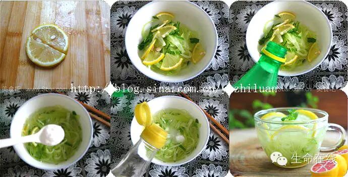 3.将笋丝、薄荷和柠檬放碗中,倒入足量的雪碧,没过笋丝。