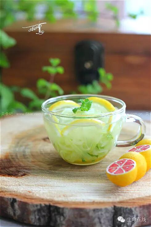 2.柠檬切两个薄片,然后切成四瓣,薄荷叶洗净切细丝。