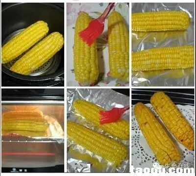 4、将玉米取出,再刷一次糖浆和植物奶油,再次送入烤箱,210度烤约15分钟即可。